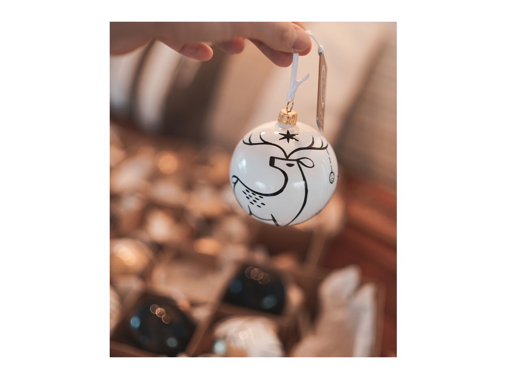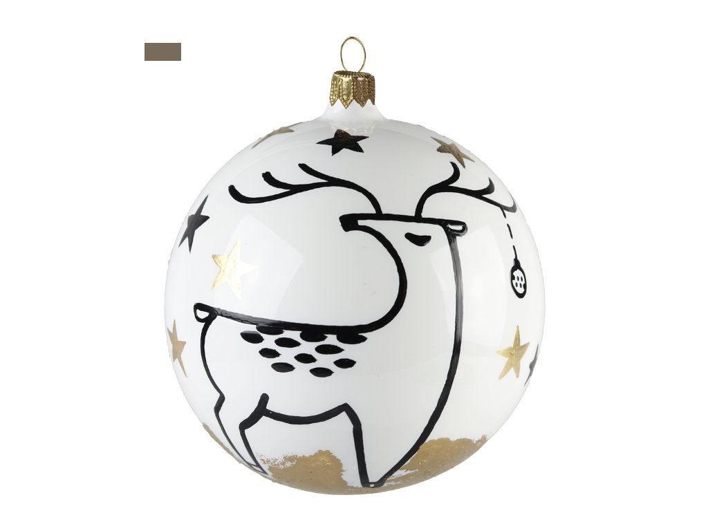 Ručně malovaná baňka s dekorem jednoduchého jelínka, který má na paroží pověšenou ozdobičku.