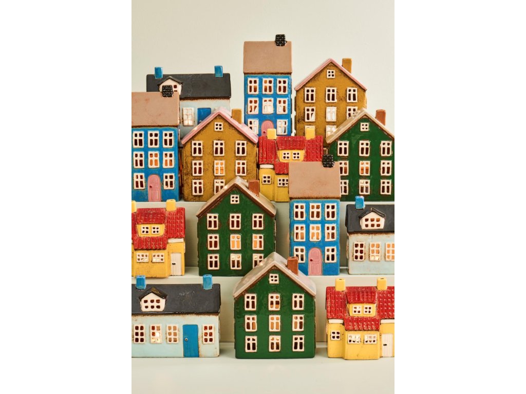 Tento keramický svícen z kolekce Nyhavn od dánské značky IB Laursen je inspirován ikonickými barevnými domky v přístavu Nyhavn v Kodani. Domeček v odstínu Green s žlutými dveřmi umístěnými na boku působí hravě, a přitom elegantně. Každý detail – od oken až po drobné linie fasády – je precizně propracovaný a ručně glazovaný.